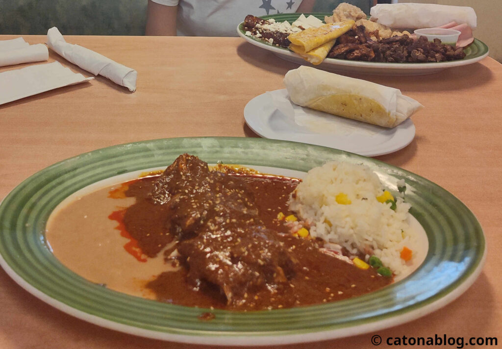 I cautiously dipped my fork into the mole and sampled a few drops. The flavor was rich and deep, a multitude of ingredients contributing to the profile and each showing its unique character. The heat caught on quickly – it did not wipe out the complexity of other tastes, though I felt a shiver in my body protesting against it “this is too much!”. I left my husband to devour the rest of his meal, while I happily tried each part of my “plato mistec”. Everything was delightful and super filling, and I had to enlist my husband’s help to finish since packing the food home was sadly not an option.