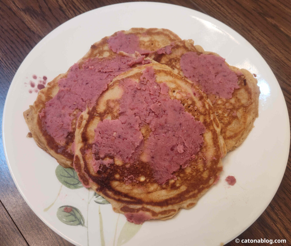 So we picked as many good-looking crabapples as we could reach. My husband took charge of cleaning and cutting off the stems, and I calculated the right amount of water, sugar, and lemon juice needed. Then came the time-consuming operation of boiling, smashing, extracting the juice, gelling, and canning. The whole procedure expanded over a week, and we were exhausted at the end, but rewarded with the ruby-like crystal jelly, and the magenta ceramic-like sauce (completely an afterthought, because the amount of pains we endured does not justify wasting seventy percent of the product).