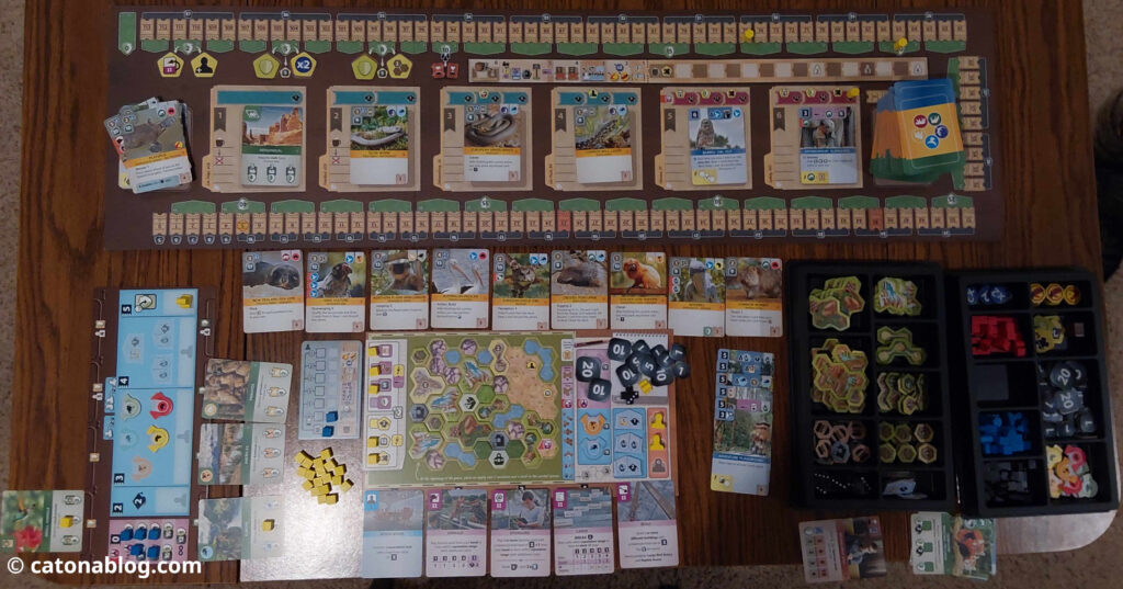 Like my usual style, when I first started this game, I looked at my hand and quickly came up with a plan – I will focus on Africa, large animals, and research. If I could carry it out perfectly, I should have a fairly nice zoo, even if it is not the winner.