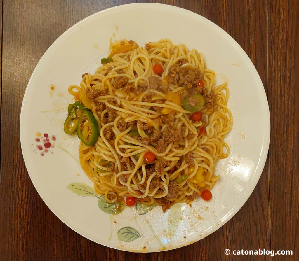 To be honest, it is not fancy – just wholesome, flavorful, filling, quick and easy. Our own homemade pasta sauce (using tomatoes from gardens of ours and our friend’s), ground beef, herb-infused olive oil, and minced garlic. Depending on the harvest, generally some fresh homegrown vegetables (e.g. peppers) are mixed in to spice it up. Applying the trick he learned from a video, my husband put a scoop of water used to cook the spaghetti into the sauce, which helps the sauce to cling better to the noodles. Finally, some basil/various members of the mint family may be the garnish on top.